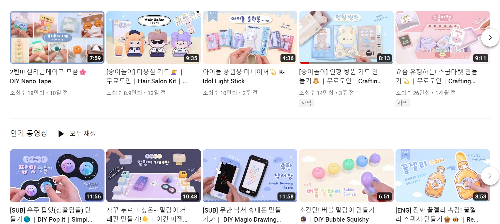주로 학용품 만들기, 장난감 만들기 등의 아기자기한 아이들 뿐만 아니라 어른들도 좋아할 정도로 귀엽고 이쁜 DIY영상이 올라오는 유튜브 입니다.