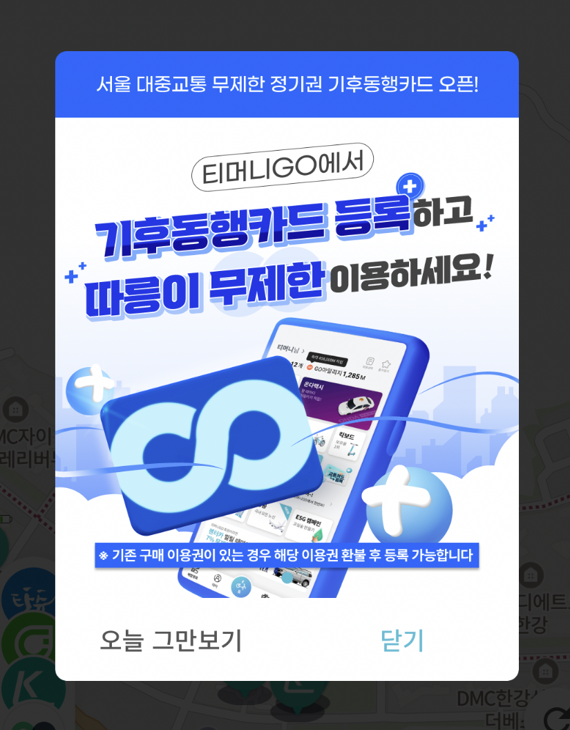 티머니 어플에서 따릉이 이용권을 구매하고, 기후동행카드 번호를 등록하면 바로 따릉이 자전거를 이용할 수 있습니다.