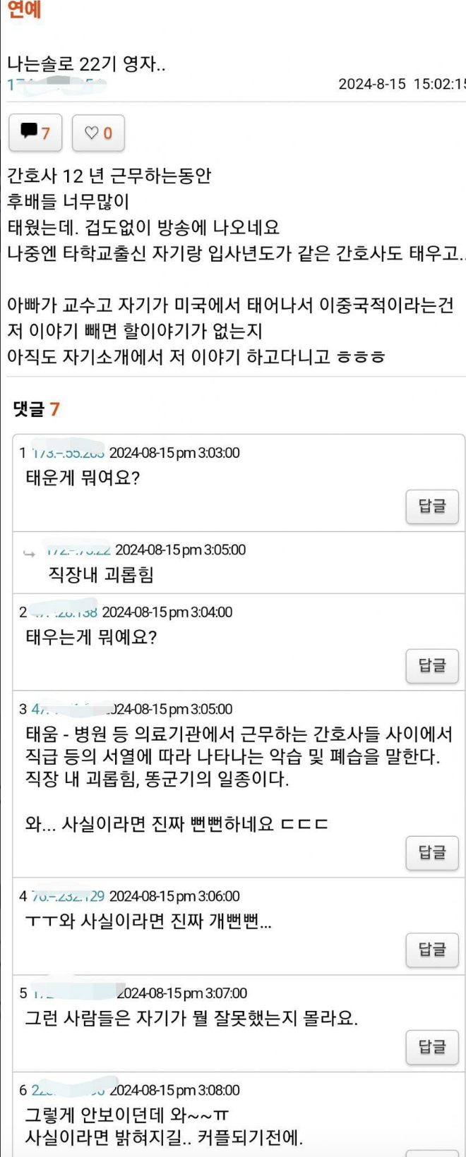 영자님의 직업과 관련된 논란은 여기서 끝이 아니에요. 최근 한 온라인 커뮤니티에 영자님의 전 직장 동료라는 사람이 그녀가 간호사로 일할 당시 후배들을 괴롭혔다는 주장을 했어요. 이로 인해 태움 논란이 발생했는데요, 이 주장이 사실이라면 그녀의 이미지에 큰 타격을 줄 수밖에 없겠죠.