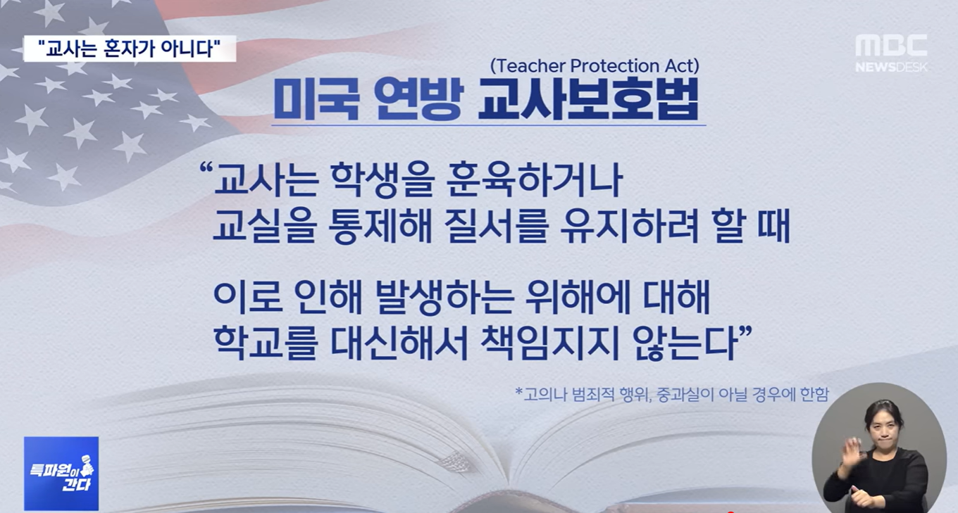 교사가 고의나 중대한 과실이 없다면 학생의 훈육과 교실 통제에 대한 책임을 지지 않으며, 교사 개인이 교육 현장에서 발생하는 일에 대한 가혹한 책임을 떠안지 않습니다.