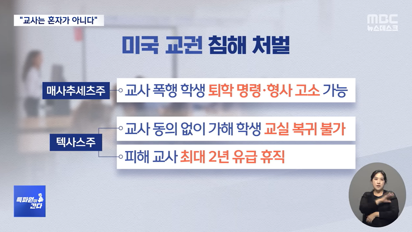 미국에서는 교권 침해 행위를 엄중히 다루고 있으며, 교사를 폭행한 학생에게는 즉각적인 처분과 퇴학 여부 결정 절차가 진행됩니다. 또한, 폭행한 학생에게는 퇴학 명령과 형사 고소도 가능합니다.