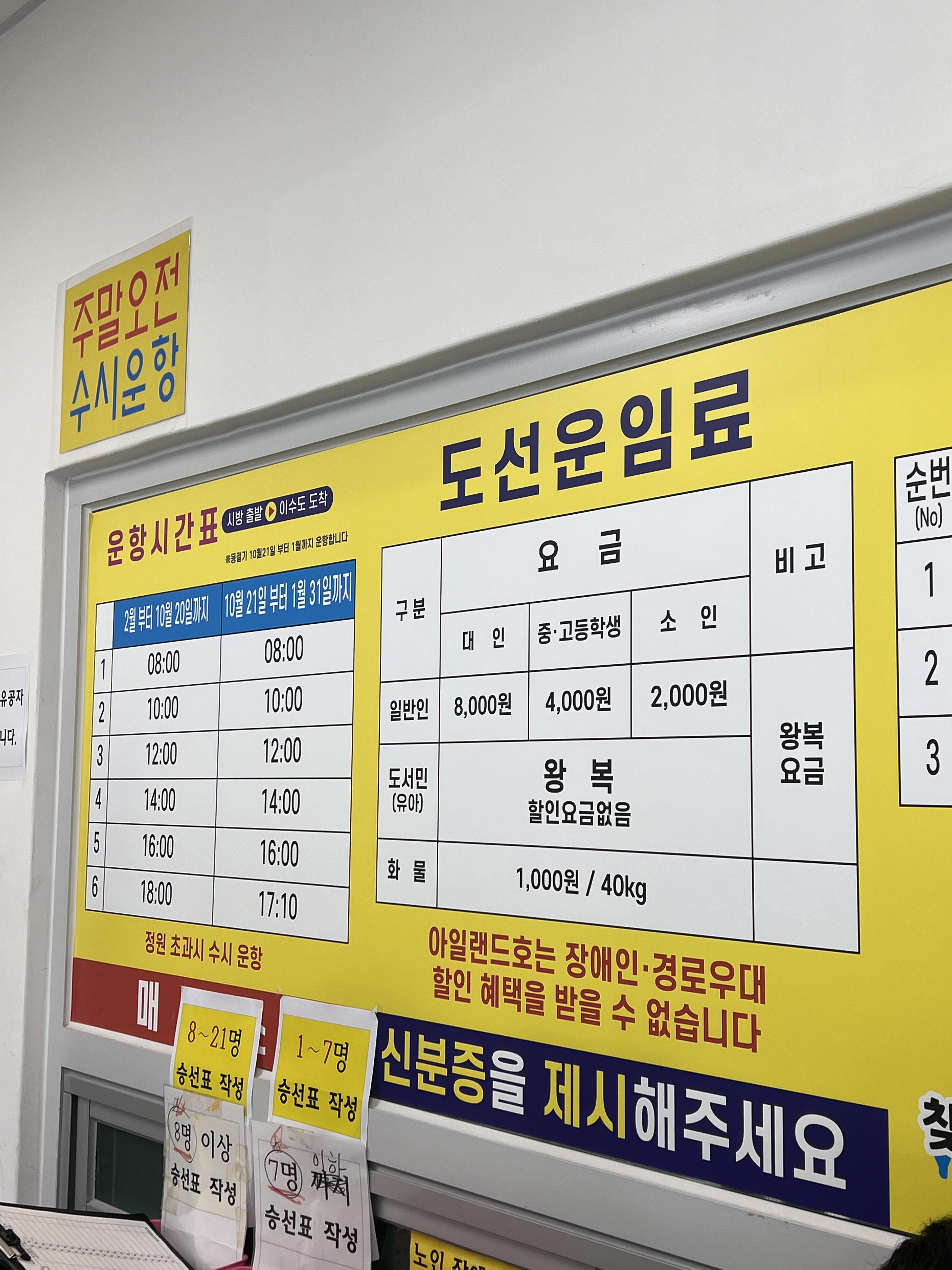 매표를 완료하면 매표 순서대로 선착순 승선이 가능합니다. 이수도에서는 아침, 점심, 저녁을 제공하므로 식사 시간에 맞추어 표를 구입하는 것이 좋습니다. 주말 오전에는 수시로 운항하나, 오후에는 정해진 시간표대로 운항합니다.