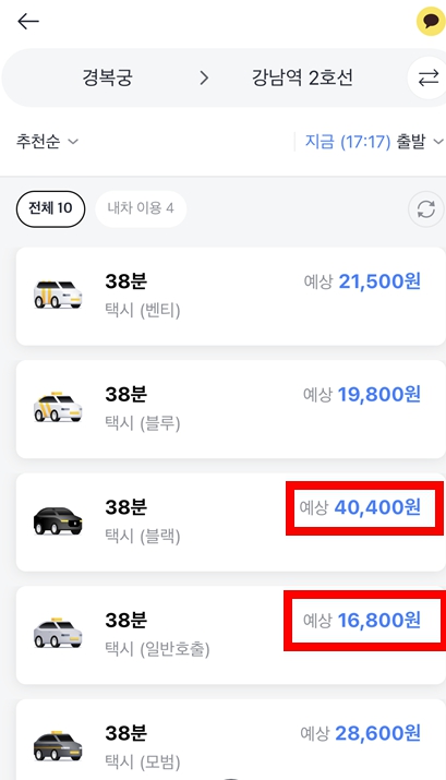 검색 시 다양한 종류의 카카오택시가 나옵니다. 벤티, 블루, 블랙, 일반, 모범 종류에 따라 금액이 상이합니다.