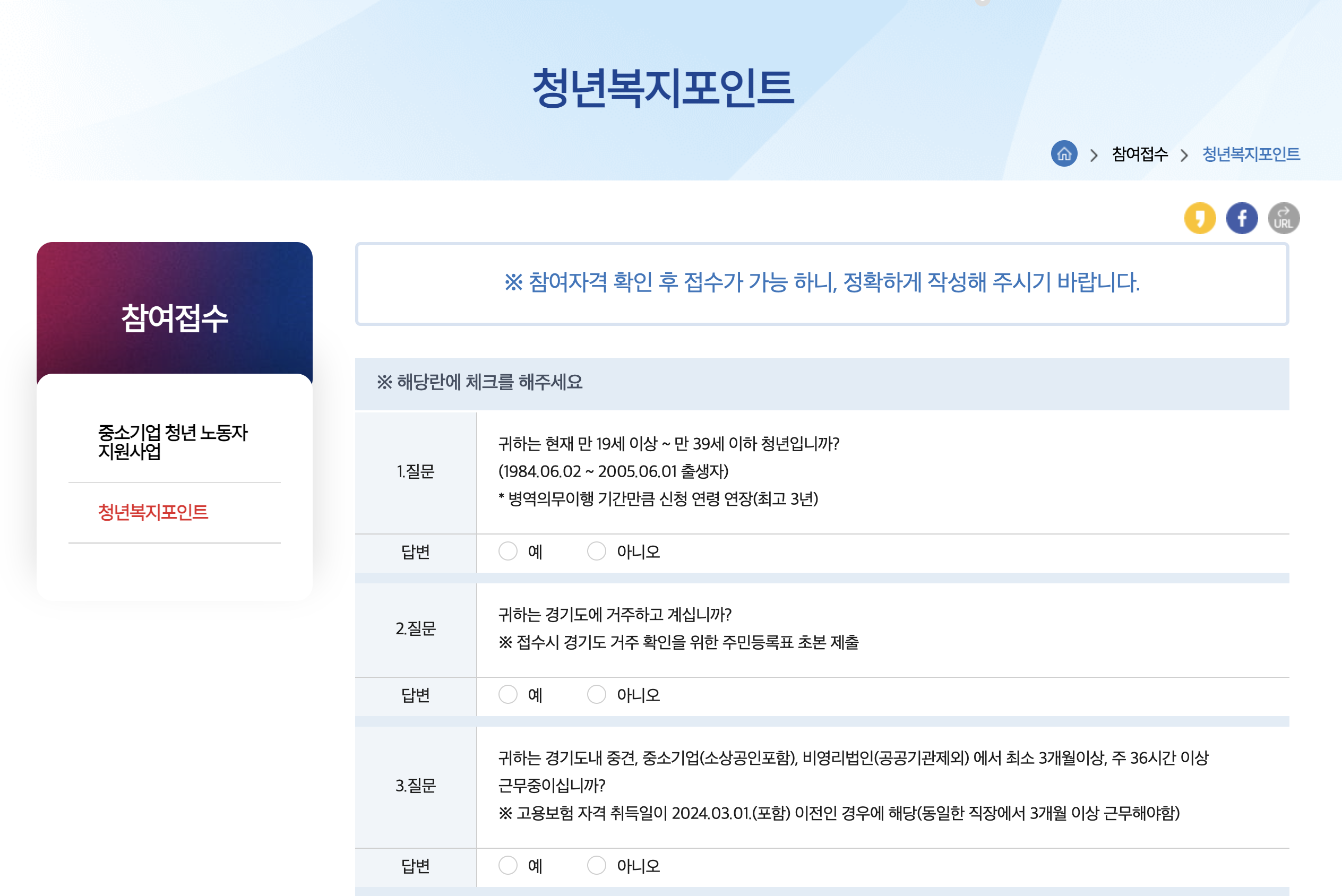 질문에 답변하여 자격 확인 후, 결과에 따라 신청 진행합니다.